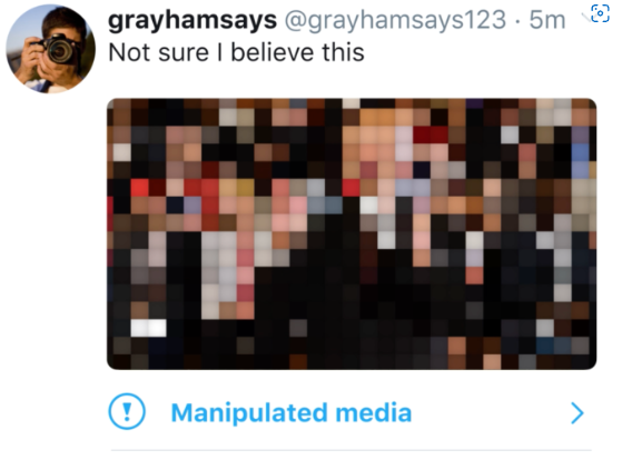2020年 Twitter 封杀了一批经常发布 deepfake 视频的账号。不过对于其它 deepfake 内容,Twitter 并没有完全限制,而是会打上一个标签“被修改的内容”(manipulated media),并且提供第三方事实核查机构的检测结果。