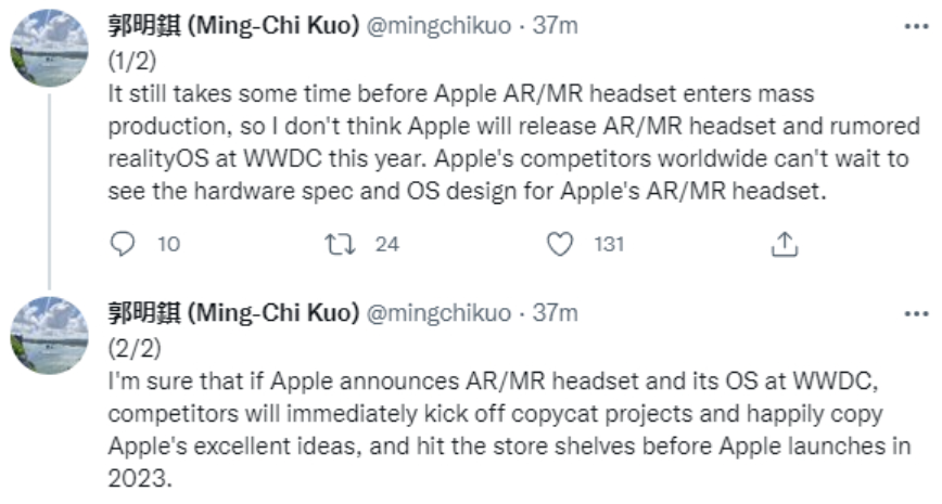 根据已曝光信息,苹果从2015年开始研发这款内部代号为N301的MR头显,该头显将搭载性能媲美M1的“桌面级”芯片。这款MR头显可能会搭载超过12个摄像头,同时采用索尼4K Mirco OLED显示屏。不过,目前全球疫情导致苹果供应链充满不确定性,MR头显是否会受到影响而推迟发售,也存在一定可能。价格方面,业内预计这款MR头显售价将会在3000美元(约合人民币20000元)以上。近日苹果分析师郭明祺发文称,苹果大概率不会在今年WWDC上发布MR头显和用于该设备的操作系统realityOS,但他还补充道,如果苹果真的发布了,那么他的竞争对手们将迅速推出类似竞品(启动山寨项目),并先于苹果上市。![]()