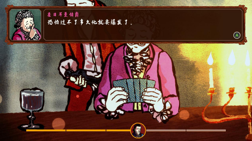 你可不要嫌麻烦,因为贵族老爷们的疑心相当重,哪怕你洗牌慢了或者发牌慢了,都会让他们的疑心加剧,而疑心则以计量槽的形式,在游戏中体现。为此,玩家势必要输一些小局,通过放弃蝇头小利来降低对手的疑心,好为自己争取更多的出千时间。