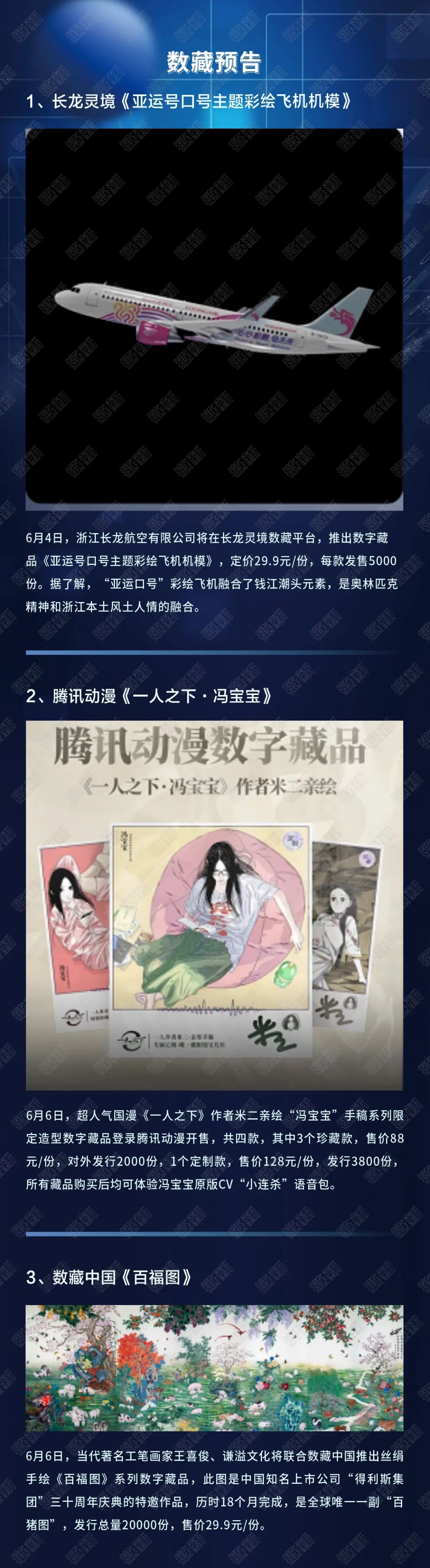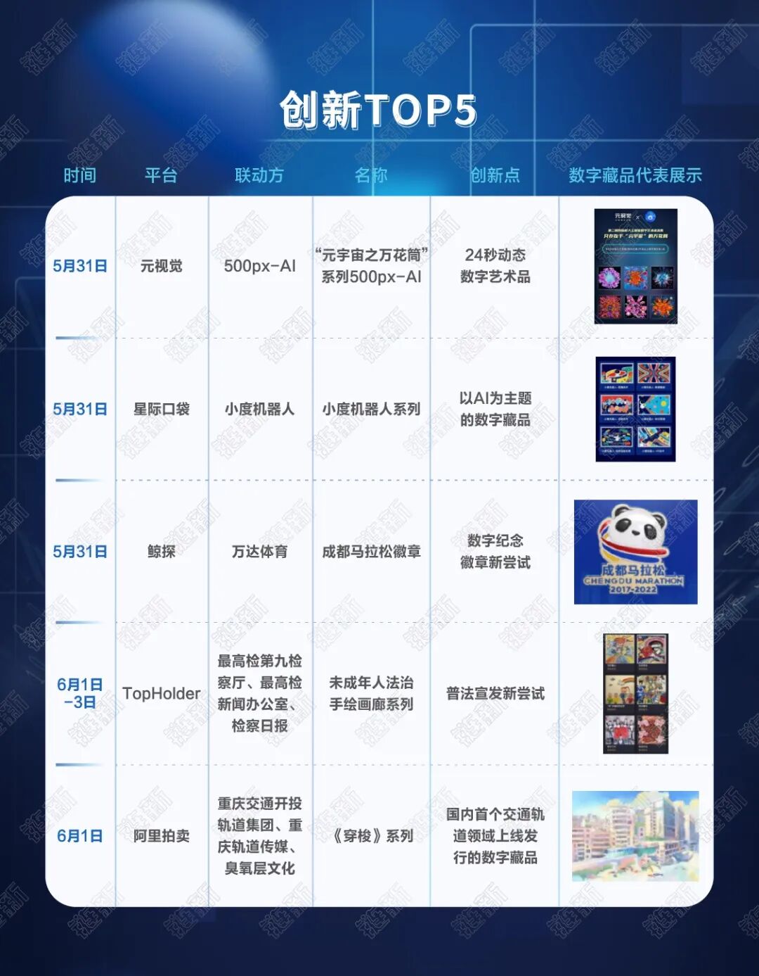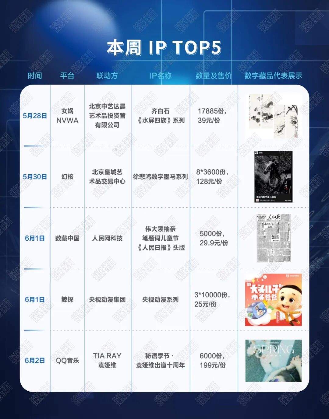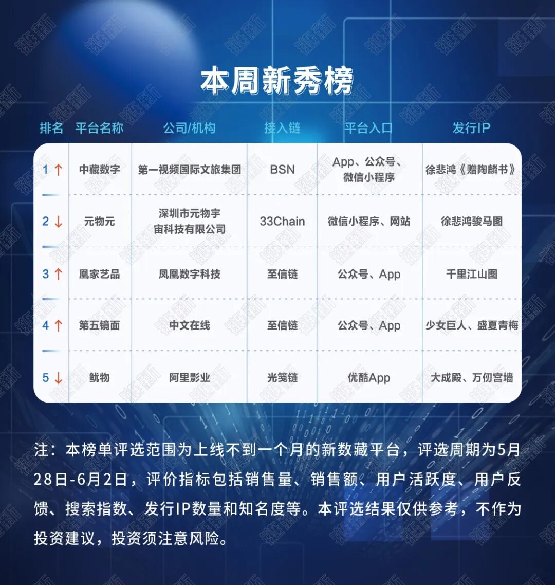 6月1日,数藏中国联合人民网发布新中国第一个儿童节《人民日报》头版数字藏品;央视动漫分别与支付宝、幻核合作,推出童年大热动漫IP系列数字藏品,如《新大头儿子小头爸爸》《哪吒》等;中国少年儿童文化艺术基金会则发布“致敬英雄 童心绘梦”版权数字藏品。目前,数字藏品已经破圈,成为各方机构的展示舞台,也成为电商平台的新型营销手段。6月1日,恰逢《未成年人保护法》和《预防未成年人犯罪法》施行一周年,最高人民检察院推出未成年人法治画廊数字藏品,进行未成年人保护相关普法教育工作。在“6·18购物节”即将到来之际,电商平台围绕“6·18”的争夺战已经打响。天猫数字藏品推出了6·18首场元宇宙大秀和筛选6·18商品功能,而京东也进入6·18预售期,将有包括1980年《足球报》创刊号、唐宫夜宴主题等数字藏品上线销售。5月30日,幻核发售徐悲鸿数字墨马藏品,而徐悲鸿美术馆则表示并未授权“幻核”发行徐悲鸿的数字藏品,对此,幻核回应称“拍卖所得的拥有者方具有独立授权来跟幻核合作的权利”。在对行业每周数据进行分析研究的基础上,《链新》联合国家新闻出版署科技与标准综合重点实验室区块链版权中心推出“每周数藏热榜”,助力行业人士深入掌握行业前沿趋势,抢抓区块链文创发展新机遇。