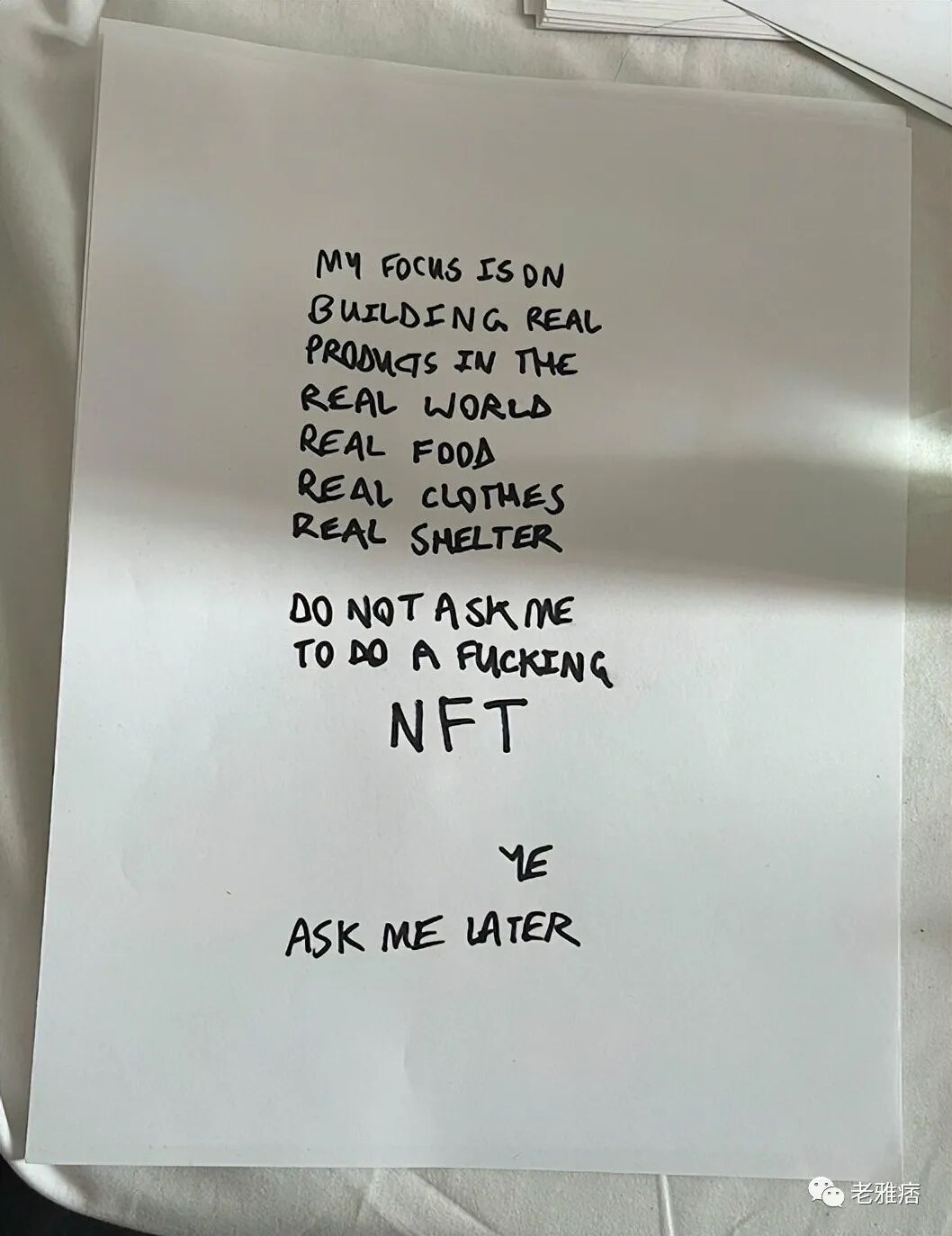 Kanye West,这位曾经在他的Instagram账户上贴出了一封手写的信,上面写着 "不要让我做一个该死的NFT "的名人说唱歌手,但他现在却似乎正准备做该死的NFT。在这封后来被删除的帖子中,Kanye West以令人难以置信的方式结束了这封信,他写道:"以后再问我吧。"