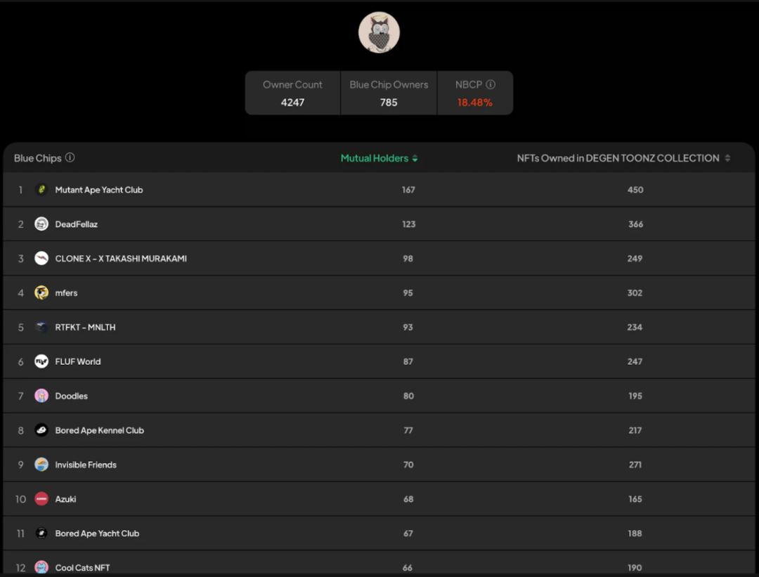 最后,查看共同持有人列表也很重要。尽管看到有 167 个变异猿持有者同时持有 450 个 Toonz 似乎很不错,但无聊猿、Punk、Doodles 和 Azuki 并未持有较大比例的 Toonz 不是一个好迹象。因此,我认为 Toonz 目前没有呈现爆发式增长的强有力支撑。![]()