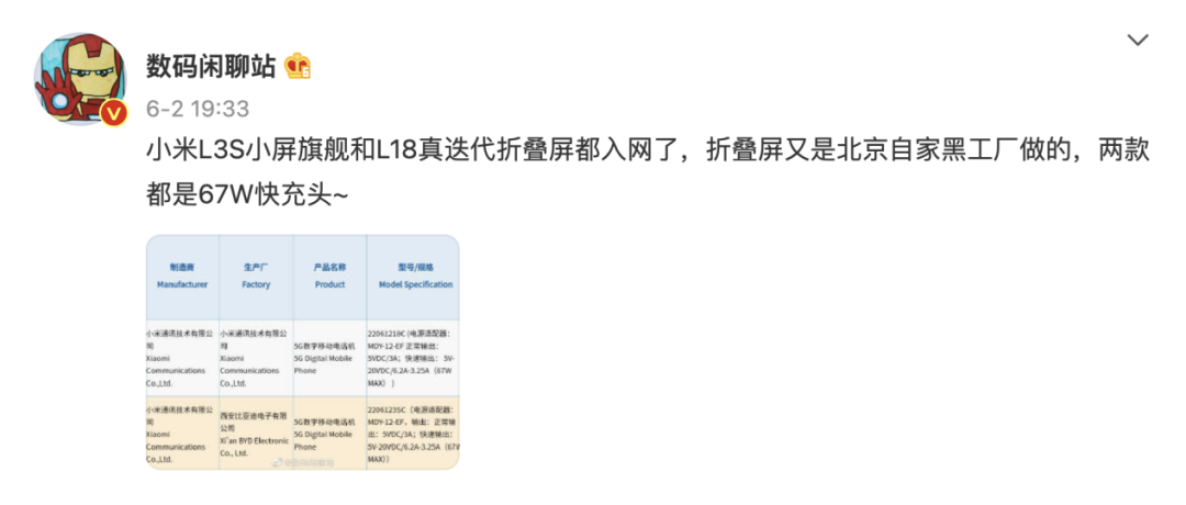 此外在近日根据爆料博主@数码闲聊站 的消息,又有两款小米新机于近期入网。据博主描述,其中L3S(2206123SC)为小米新款小屏旗舰,而L18(22061218C)为小米新一代折叠屏手机。