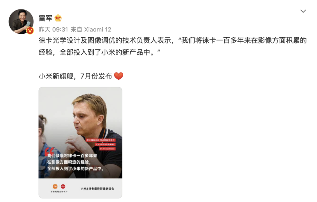 此外在昨天,小米CEO雷军再次预热与徕卡合作的首款机型小米12 Ultra,并且表示将于7月发布。雷军引用徕卡光学设计及图像调优的技术负责人的话:“我们将徕卡一百多年来在影像方面积累的经验,全部投入到了小米的新产品中。”