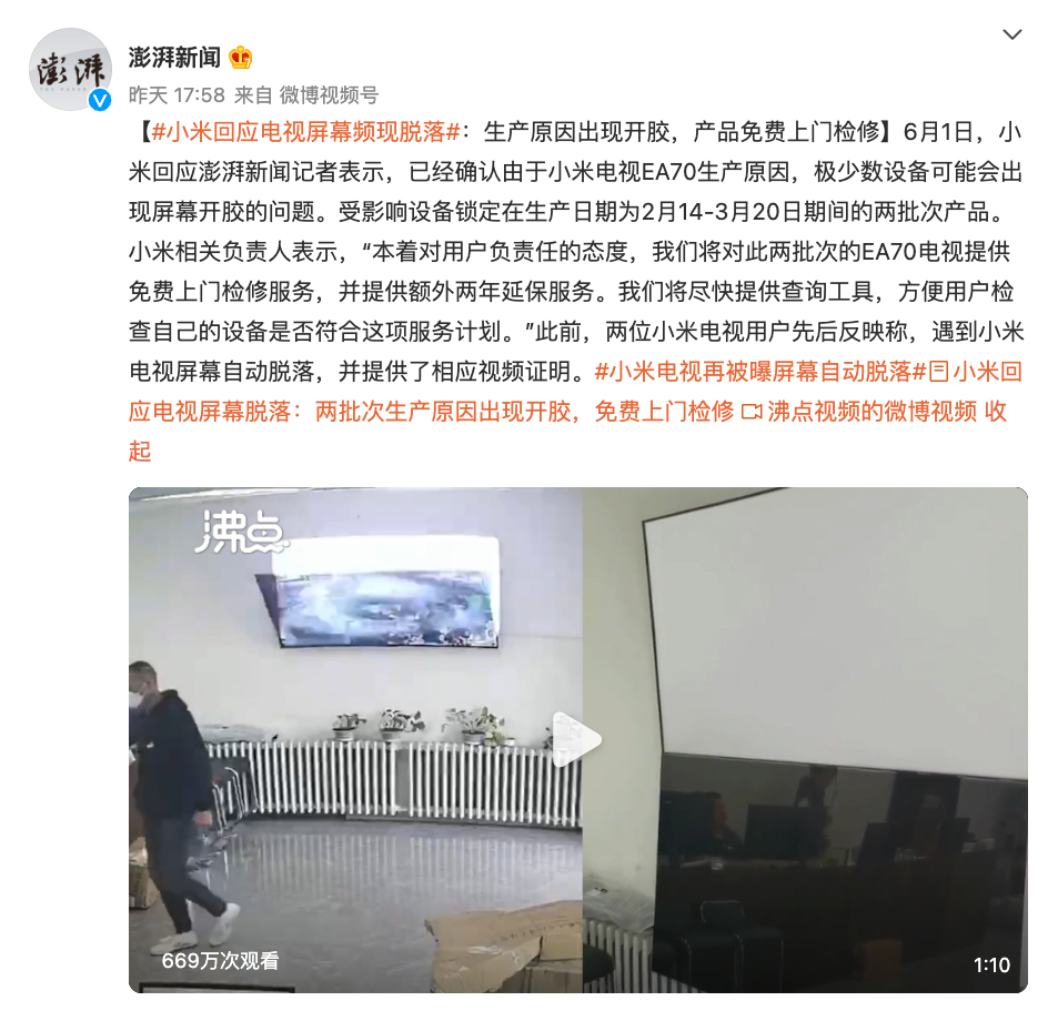 就在这之后据澎湃新闻消息,小米对于此事回应表示小米电视EA70连续发生该问题确实属于生产原因,极少数设备可能会出现屏幕开胶的问题。出现问题的批次官方锁定在生产日期为2月14-3月20日期间的两批次产品。