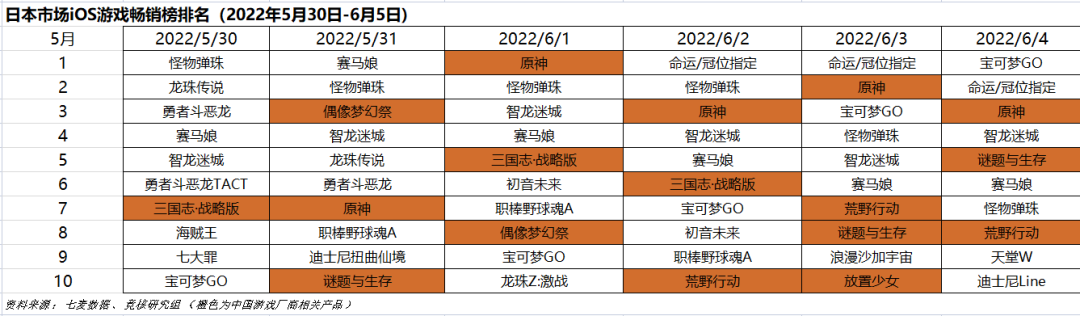 日本2022年5月30日——6月4日iOS游戏类畅销榜中,网易游戏、米哈游、三七互娱、有爱互动、乐元素等在列。