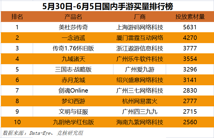 吉比特、阿里游戏、网易游戏等大厂旗下产品依旧在列。吉比特《一念逍遥》投放素材量4982组,位列榜单第二位 。此外还包括阿里游戏《三国志·战略版》、四三九九《文明与征服》、网易游戏《梦幻西游》等。