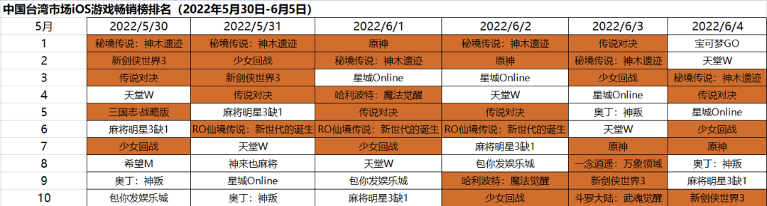 中国台湾市场2022年5月30日——6月4日iOS游戏类畅销榜中,宝通科技《新剑侠世界3》、4399《秘境传说:神木遗迹》、米哈游《原神》、龙腾简合《少女回战》、腾讯《传说对决》登上Top3行列。