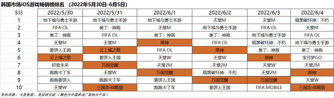 国产手游除“老熟人”米哈游《原神》外,莉莉丝《万国觉醒》、阿里游戏《三国志·战略版》、三七互娱《云上城之歌》等也成功打入韩国App Store游戏畅销榜Top10。