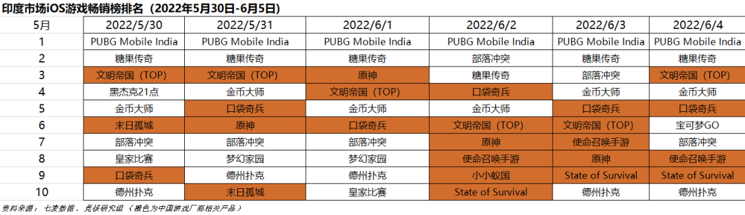 中国游戏厂商方面,米哈游《原神》、FunPlus《State of Survival》、腾讯游戏《使命召唤手游》、江娱互动《口袋奇兵》、星合互娱《小小蚁国》、龙创悦动《末日孤城》(也称守望黎明)、TOP GAMES《文明帝国》等进入印度App Store游戏畅销榜Top10。