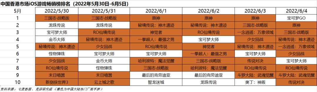 中国香港市场2022年5月30日——6月4日iOS 游戏类畅销榜中,大陆在港游戏方面,、阿里游戏《三国志·战略版》、米哈游《原神》、4399《秘境传说》、莉莉丝《神觉者》、骏梦游戏《RO仙境传说:新世代的诞生》以及吉比特《一念逍遥》进入第一梯队(Top3)