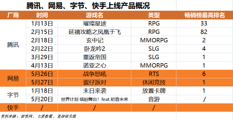 2022产品上新方面,截至2022年6月5日,今年以来腾讯、网易、字节、快手等互联网大厂分别上线了8款、2款、2款、0款手游产品。