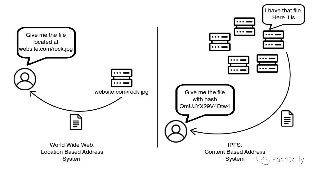 IPFS是一个点对点的文件存储网络。一个被称为节点的计算机阵列存储已上传到网络的文件,并使用独特的哈希值来识别这些文件。IPFS和基于网络的文件存储之间最大的区别是,IPFS使用了一个基于内容的地址系统。当一个文件请求被提出时,网络会使用文件的哈希值找到持有该文件的节点,并将其提供给请求者。