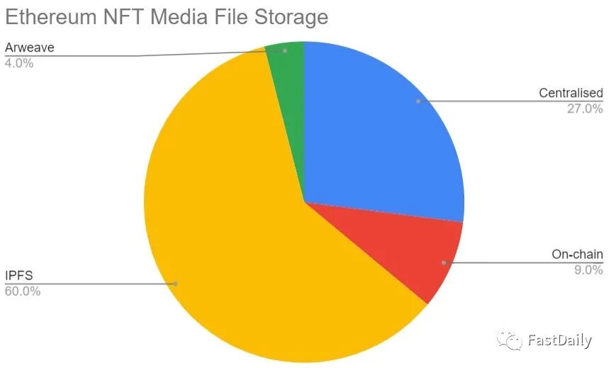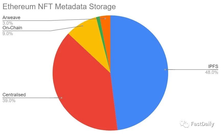 在以太坊上,IPFS是最受欢迎的NFT元数据存储媒介。按交易量排名前100的NFT合约中,48%的合约的元数据存储在IPFS上。不幸的是,集中式服务器是以太坊上NFT元数据存储的第二大选择。