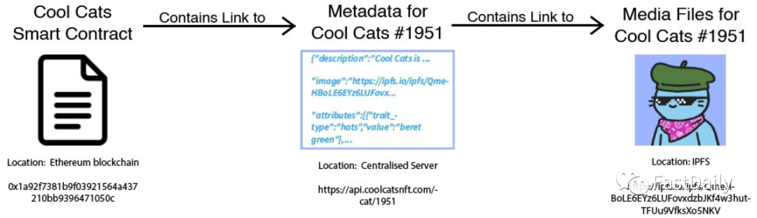 将这些信息直接存储在区块链上是很昂贵的,所以大多数NFT项目将其数据存储在其他地方,只在其智能合约中保留一个链接。