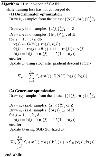def generator(x,m):inputs = tf.concat(values = [x, m], axis = 1)G_h1 = tf.nn.relu(tf.matmul(inputs, G_W1) + G_b1)G_h2 = tf.nn.relu(tf.matmul(G_h1, G_W2) + G_b2)G_prob = tf.nn.sigmoid(tf.matmul(G_h2, G_W3) + G_b3)return G_probdef discriminator(x, h):inputs = tf.concat(values = [x, h], axis = 1)D_h1 = tf.nn.relu(tf.matmul(inputs, D_W1) + D_b1)D_h2 = tf.nn.relu(tf.matmul(D_h1, D_W2) + D_b2)D_logit = tf.matmul(D_h2, D_W3) + D_b3D_prob = tf.nn.sigmoid(D_logit)return D_probX = tf.placeholder(tf.float32, shape = [None, dim])M = tf.placeholder(tf.float32, shape = [None, dim])H = tf.placeholder(tf.float32, shape = [None, dim])D_W1 = tf.Variable(xavier_init([dim*2, h_dim]))D_b1 = tf.Variable(tf.zeros(shape = [h_dim]))D_W2 = tf.Variable(xavier_init([h_dim, h_dim]))D_b2 = tf.Variable(tf.zeros(shape = [h_dim]))D_W3 = tf.Variable(xavier_init([h_dim, dim]))D_b3 = tf.Variable(tf.zeros(shape = [dim]))theta_D = [D_W1, D_W2, D_W3, D_b1, D_b2, D_b3]G_W1 = tf.Variable(xavier_init([dim*2, h_dim]))G_b1 = tf.Variable(tf.zeros(shape = [h_dim]))G_W2 = tf.Variable(xavier_init([h_dim, h_dim]))G_b2 = tf.Variable(tf.zeros(shape = [h_dim]))G_W3 = tf.Variable(xavier_init([h_dim, dim]))G_b3 = tf.Variable(tf.zeros(shape = [dim]))theta_G=[G_W1,G_W2,G_W3,G_b1,G_b2,G_b3]