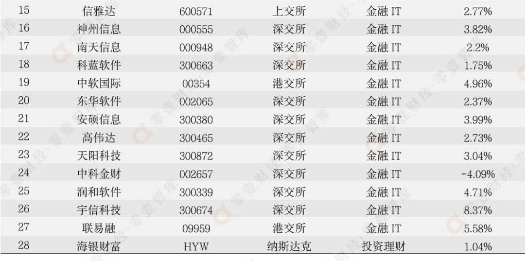 据零壹智库不完全统计,国内28家上市金融科技公司中,7家公司股价下跌,跌幅最大是“乐信”为-22.78%;21家公司上涨,涨幅最高是“财富趋势”为19.15%。16家金融IT企业中,涨幅达1%-5%的企业11家,涨幅超5%以上企业3家。