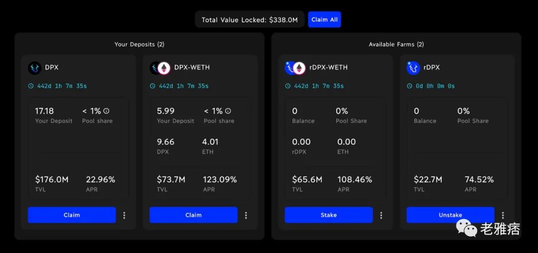 但是对于Dopex来说,目前质押收入是以DPX和rDPX支付的,作为释放代币的一种方式,直到他们开启收入分享。因此,它还没有像Convex那样好的现金流系统,但它至少减少了你的协议份额被稀释的程度。他们将在不久的将来的某个时候将其转换为一个真正的收入分享系统。