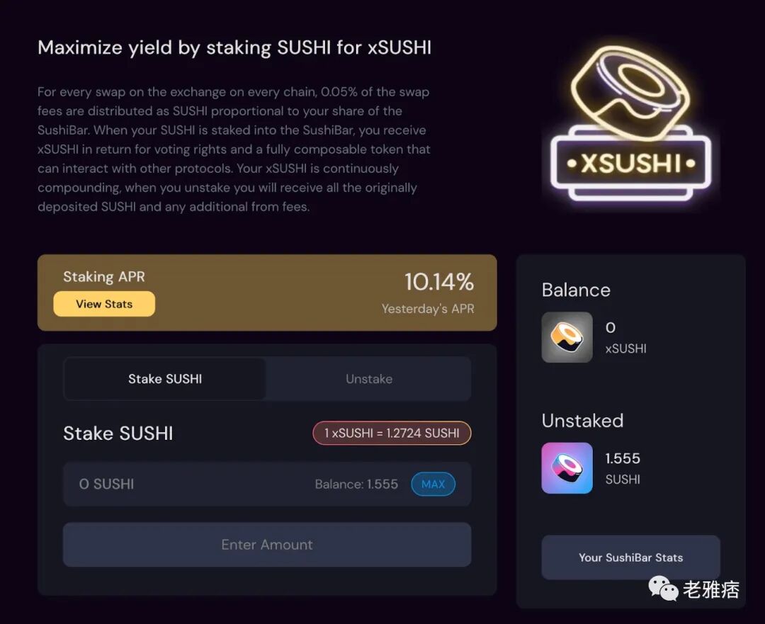 xSUSHI是一种 "流动质押代币"。你已经质押了你的SUSHI,你正在赚取费用,但你赚取费用的方式是通过xSUSHI的交易价值随着时间推移而增加。这让你可以把你的xSUSHI带到其他地方,以备你想把它存入AAVE或其他地方作为抵押品再次借款。