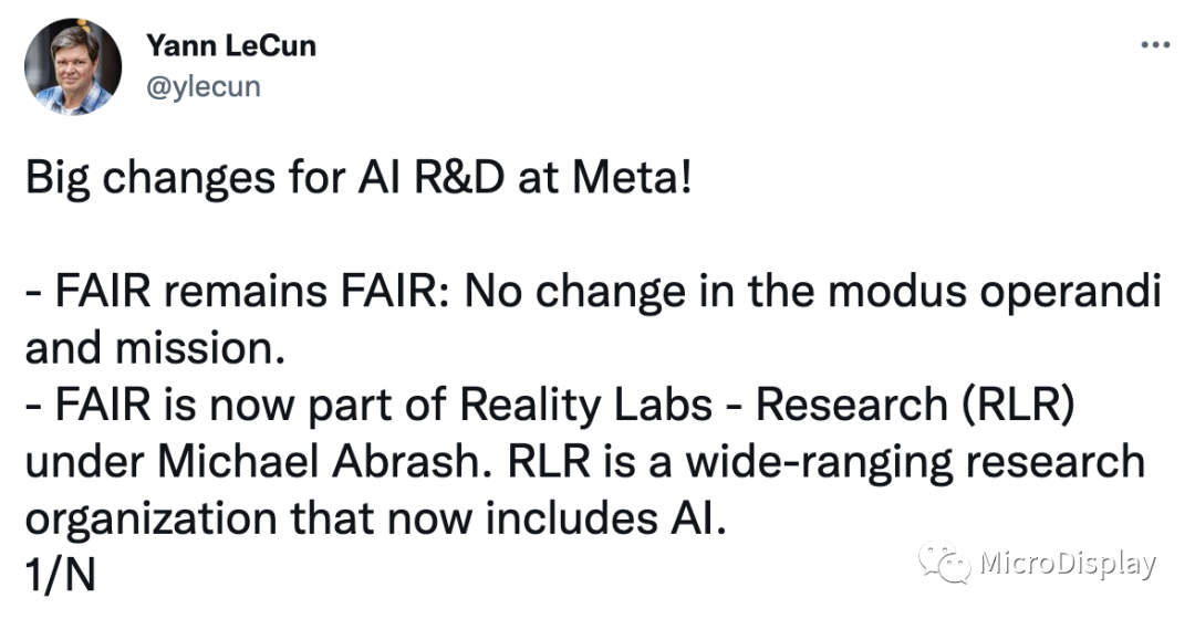 FAIR的负责人、Meta首席科学家杨立昆(Yann LeCun)在推特上确认了FAIR将成为Reality Labs研究部门(RLR)下属组织的消息。FAIR将由Joelle Pineau、Antoine Bordes和LeCun共同领导。