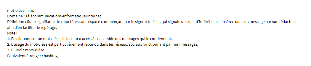 例如,他们要用“井号”(mot-dièse)指代社交媒体软件的标签(hashtag),用“多功能手机”(mobile multifonction)替代智能手机(smartphone),以及用“无线访问互联网”(l'access sans fil à internet)替代简单的“Wifi”一词。前两条建议均被法国政府采纳,唯独最后一条可能因为太过繁琐,未被采用。