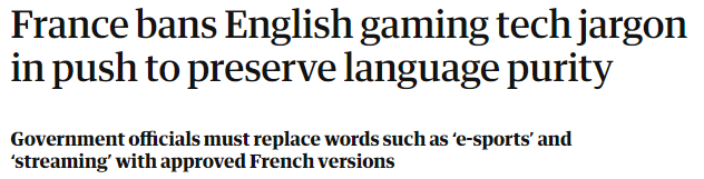 现在法国政府称呼职业玩家(pro-gamer)的方式是“joueur professionalnel”,而电子竞技要从e-sport改成“jeu vidéo de compétition”,相当于中文的“电子游戏竞技”。