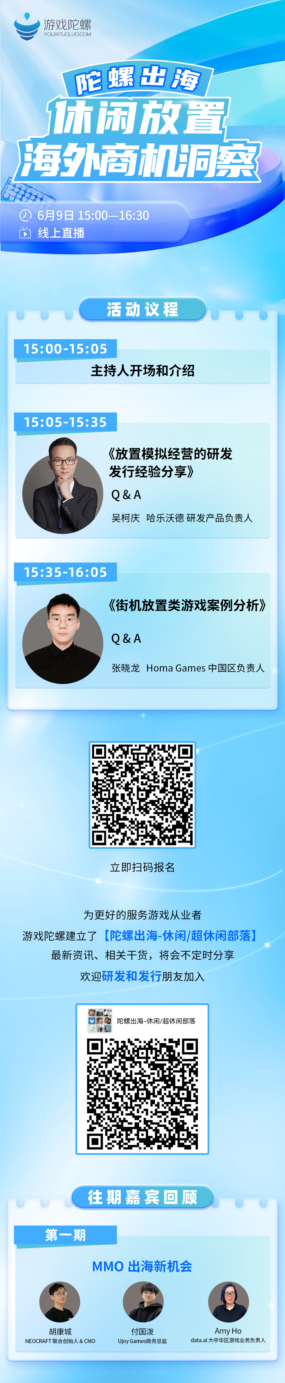 6月9日,由游戏陀螺举办的【陀螺出海-休闲放置海外商机洞察】线上沙龙,来自哈乐沃德的研发产品负责人吴柯庆和Homa Games中国区负责人张晓龙,将带来有关放置类游戏的主题分享。同时我们建立【陀螺出海-休闲/超休闲部落】群,欢迎研发和发行朋友加入,希望共建一个优质的行业交流群。