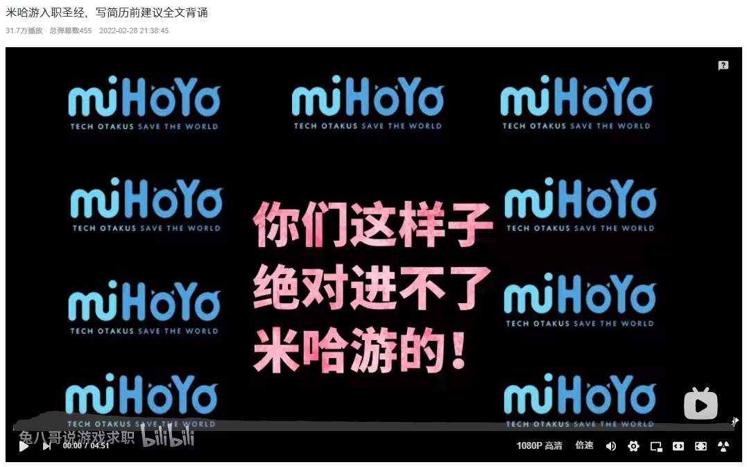 B站“米哈游入职圣经”视频,播放量超30万(来源:UP主“兔八哥说游戏求职”)