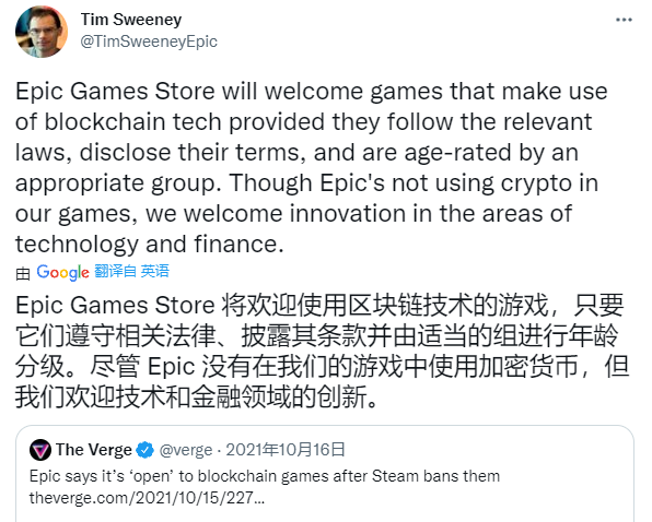 仿佛是为了和Steam对着干,Epic Games的首席执行官蒂姆·斯威尼(Tim Sweeney)听到消息后当即发推表示,Epic平台愿意欢迎合法合规的区块链游戏。