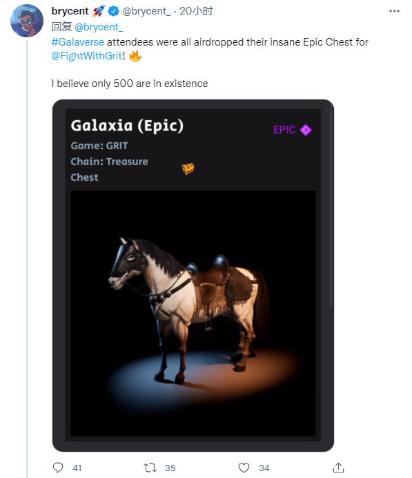 一位网名叫做brycent的“NFT游戏内容创作者”参加过Galaverse之后,在推特上大加吹捧《Grit》,还晒出了自己从箱子里开出的“史诗级”马匹。他说,“我相信这样的马在游戏里只存在500匹”。