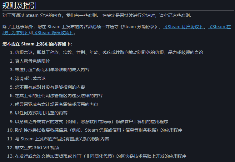 自2021年10月起,Steam平台的分销政策多了一条内容,禁止玩家上架任何基于区块链技术基础上开发的程序。现有的游戏不得出现加密货币或NFT(非同质化代币)要素,否则必须立刻下架。