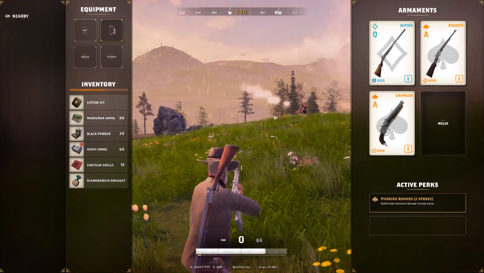 开发团队也加入了自己的一些创意。在《Grit》中,可拾取的武器道具和服装,都有对应的扑克牌花色和点数。点数越大的武器越稀有也越强大,但凑够特定点数与花色组合的扑克牌与装备,可以让玩家获得额外的技能和加成效果。