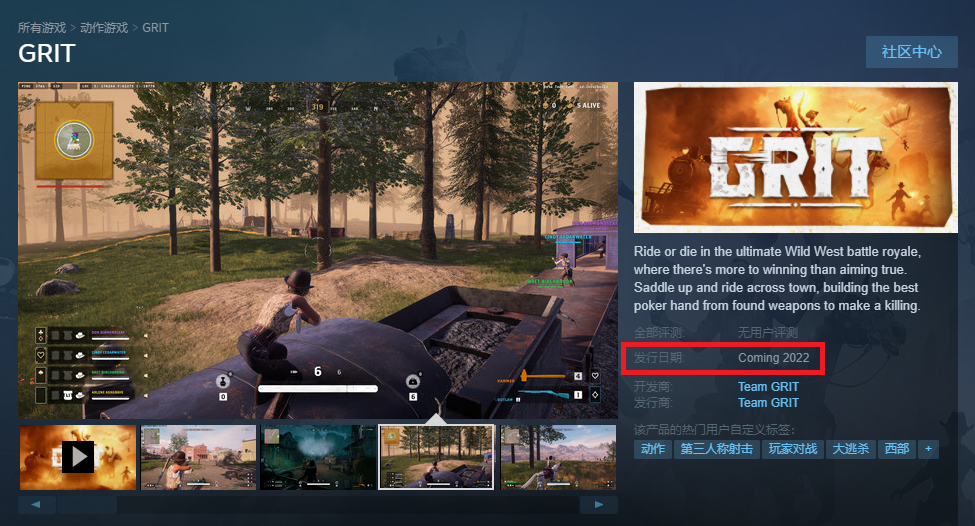 这部游戏叫《Grit》,由一家同名的小工作室制作,是一部西部题材的第三人称大逃杀游戏。开发团队坦承他们玩过很多大逃杀游戏,最终按《绝地求生》的风格设计了《Grit》,就连使用的游戏引擎,也是《绝地求生》用过的虚幻引擎。