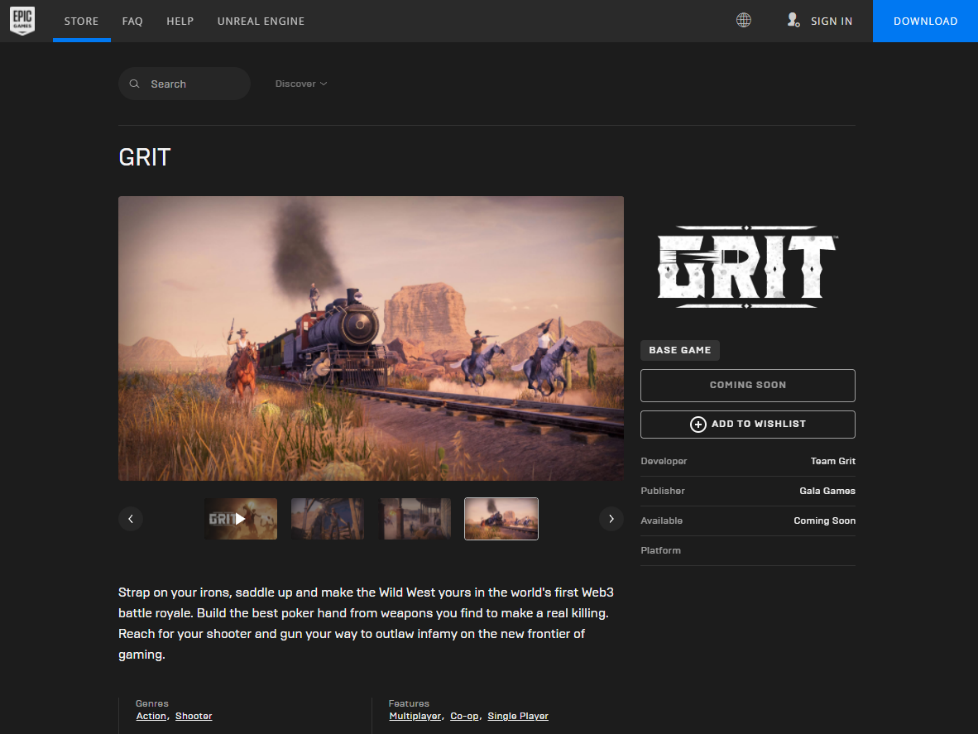 6月6日,在公司的Galaverse大会上,Gala Games又宣布与Epic建立了合作伙伴关系。作为合作的一环,《Grit》将正式引入NFT要素,登陆Epic平台。《Grit》将成为Epic平台上首次引入区块链技术的游戏,以及首款引入区块链技术的大逃杀游戏。