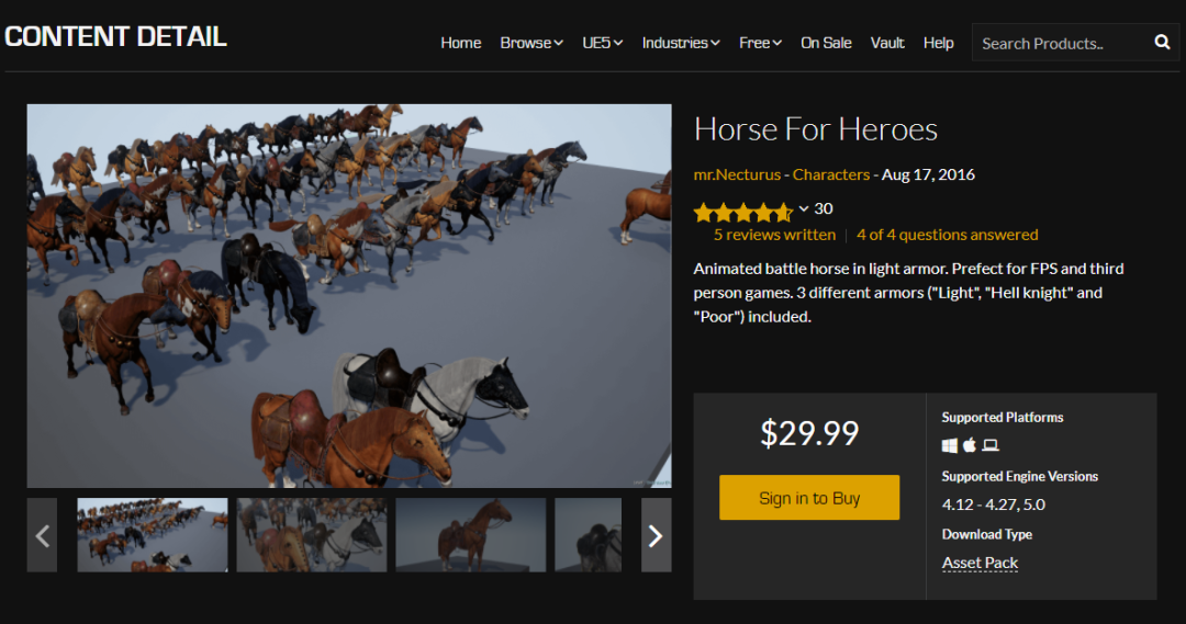 任何人只要花上29.99美元(约合人民币199.9元),就能在自己的虚幻引擎软件,乃至自制的游戏中,随意使用包括“史诗”马在内的10种具有不同纹理的马匹。买家得到的是实际的模型文件,而非象征自己所有权、会随服务器倒闭与卖家跑路而丢失的虚拟数字凭证。