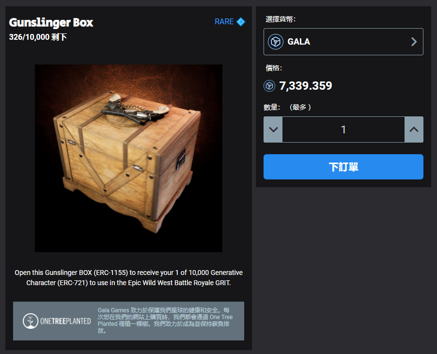 与此同时,《Grit》的NFT也正式上架。Gala Games官网商店推出了10000个“枪手箱子”,每个箱子对应一个随机生成且“独一无二”的游戏内角色,拥有独特的外观、技能和属性,可在游戏发售时立即使用。