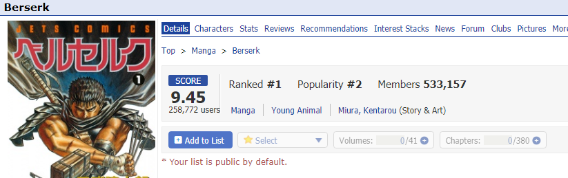 漫画评分权威网站MAL上《剑风传奇》至今排名第一