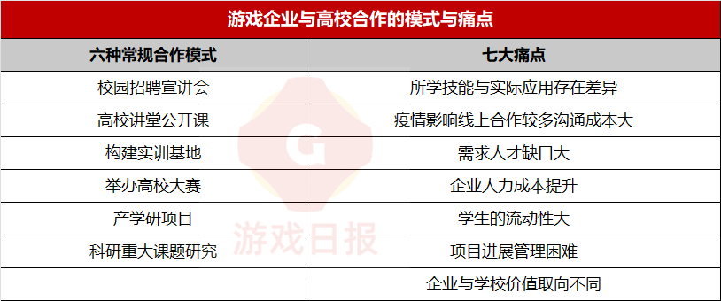 对此,游戏日报又与包括米哈游、盛趣游戏、三七互娱、吉比特在内的多家校企负责人进行了交流,了解到目前在整个游戏行业,企业与高校合作的方式也各不相同,同时在合作时也存在不少痛点,但整体可归纳为“6种常规合作模式与7大痛点”。