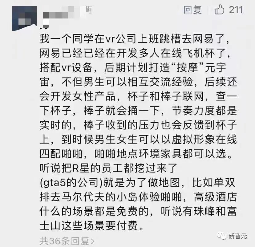 还有人称自己的一个同学跳槽去网易了。并透露目前网易已经在开发多人在线飞机杯了,搭配VR设备后,后期计划要打造「按摩」元宇宙。