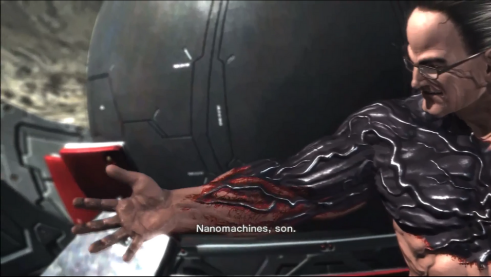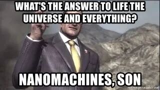 2013年《合金装备崛起:复仇》刚发售时,就有玩家尝试把这段名场面做成梗图。他们认为,阿姆斯特朗的纳米机器,不仅能够挡下物理攻击,更是宇宙间万事万物的终极答案,任何问题都能用纳米机器完美解决。