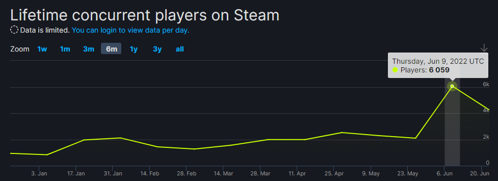 2022年6月,Steam平台给游戏打了个二五折,对于一部发售了9年的游戏而言,不算稀奇事。稀奇的是,Steam游戏在线人数峰值很快突破6000人,达到历年来的最高点。