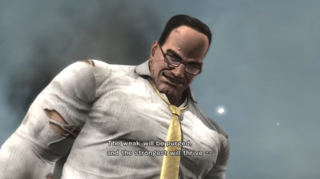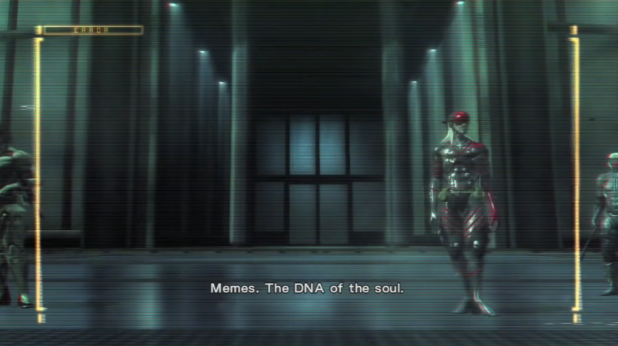 这份剧本也少不了《合金装备》历来引人反思的深刻台词与理念。《合金装备崛起:复仇》本身,就是一部将梗的原意——模因(Memes)一词的讨论摆上台面的作品。