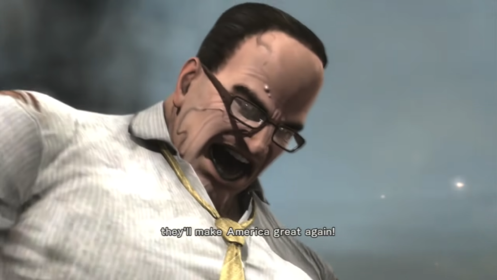 游戏的英语本地化团队,为这段演出掺了不少“私货”。他们引入大量的脏话与英语梗,修改日语原台词的译义,来贴合美国人的语言习惯。加上配音演员的卖力演出,阿姆斯特朗的每一句台词,都像贯穿游戏始终的摇滚乐一般,富有无穷的张力。