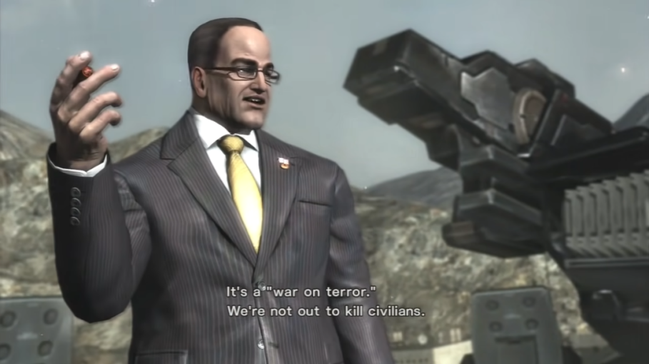 阿姆斯特朗的政治主张也坏到了骨子里。基于《合金装备》本传世界观下的政治混乱与经济衰退,他要竞选总统,通过在世界各地发起所谓的“反恐战争”,创造就业机会,重振美国经济。
