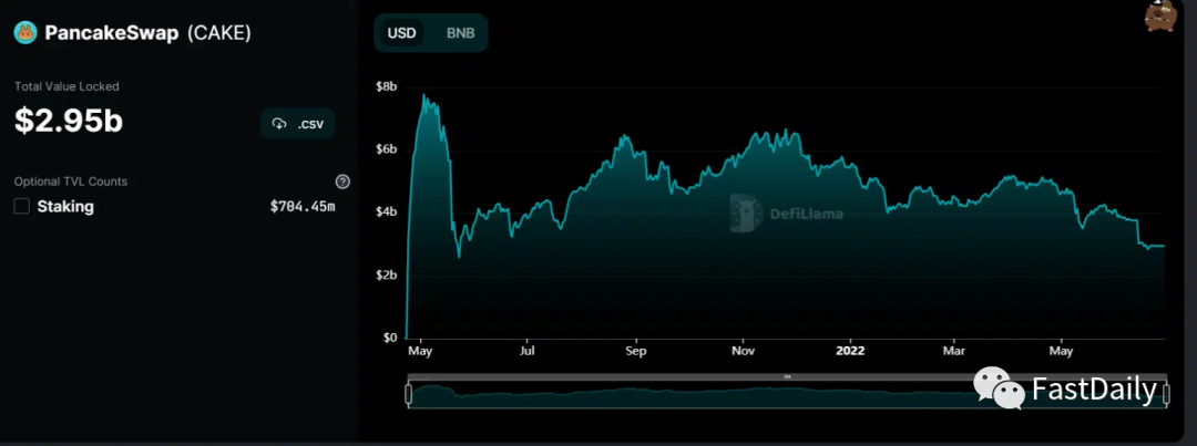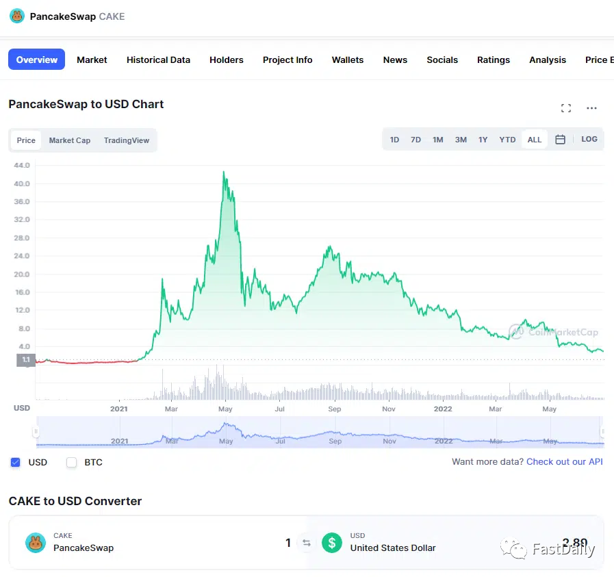 根据CoinMarketCap的数据,CAKE目前的交易价格为2.89美元,接近当前周期中2.51美元的历史低点,市值为4.1亿美元。该token在去年4月曾创下44.18美元的历史新高。CAKE目前的价格归因于当前的熊市情况和作为提供流动性奖励的稳定的token发行。CAKE未来的价格走势很大程度上取决于BSC链和建立在它之上的Defi生态系统的不断适应。