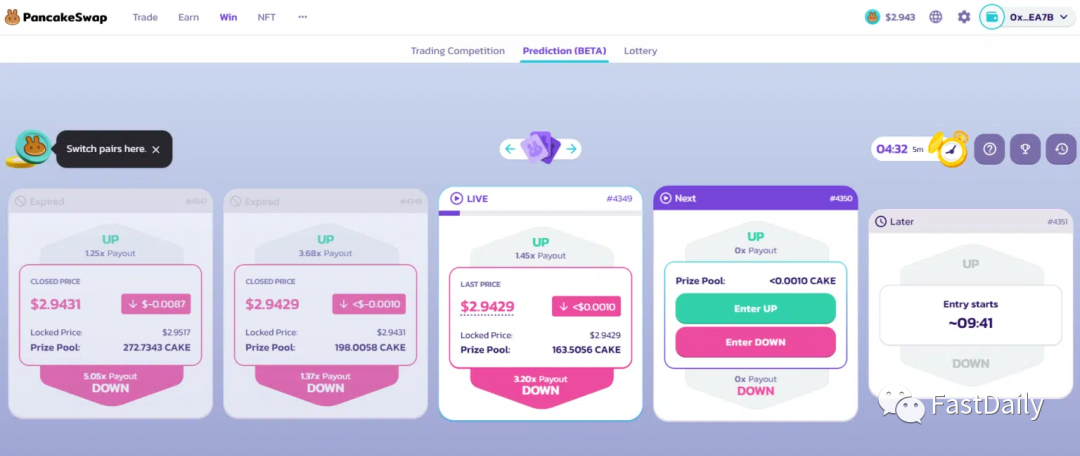 PancakeSwap的预测市场允许用户通过准确预测BNB-USD或CAKE-USD的价格变动来赚取token。用户可以在五分钟的时间范围内押注BNB或CAKE的价格上涨或下跌。