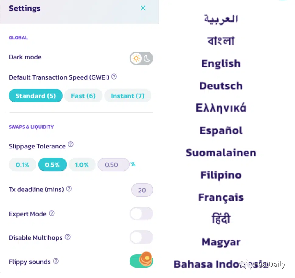 从设计的角度来看,该平台为用户提供了广泛的语言选择。支持的语言有英语、荷兰语、西班牙语、法语、阿拉伯语、俄语等。PancakeSwap还允许用户通过语言选择图标旁边的设置图标来配置他们的首选交易设置。它还提供了夜间模式设置,以降低屏幕产生的白光强度。