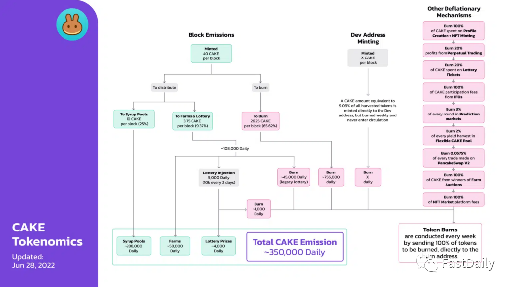 CAKE既是治理token,也是PancakeSwap交易所的奖励和实用token。CAKE的持有者可以对治理决策进行投票,申请永续期货交易费用的折扣,获得IFO的访问权以及购买彩票等。