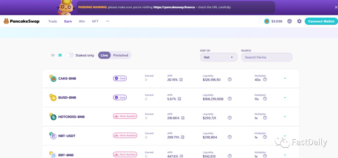 用户可以通过向PancakeSwap上的流动性池提供流动性,以CAKE token的形式获得奖励。PancakeSwap有几个yield farm,所有这些都需要你押注两个token来获得与确切农场相对应的LP token。PancakeSwap上的每个农场都有自己的收益率和倍数,所以在提供流动性之前一定要确定你想从哪个农场赚钱。例如,CAKE-BNB农场有40倍的乘数,这意味着,每生产一个区块,就可以获得40个CAKE。