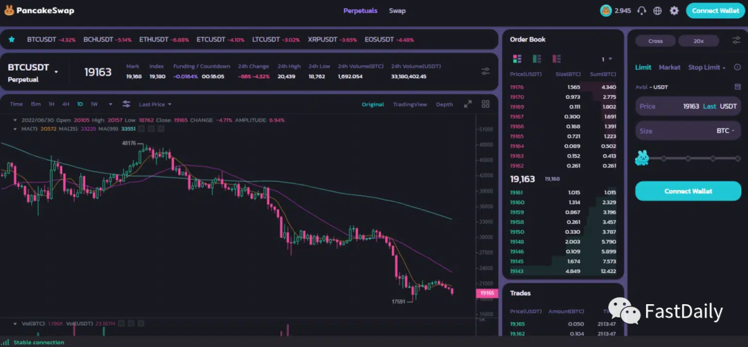 PancakeSwap与ApolloX Finance合作,允许用户在其界面上交易永续期货合约。该交易基础设施采用链下订单簿匹配和链上结算,支持不同订单类型(如限价单、止损单和被动委托)等关键交易功能,同时保持了DEX的隐私和安全。